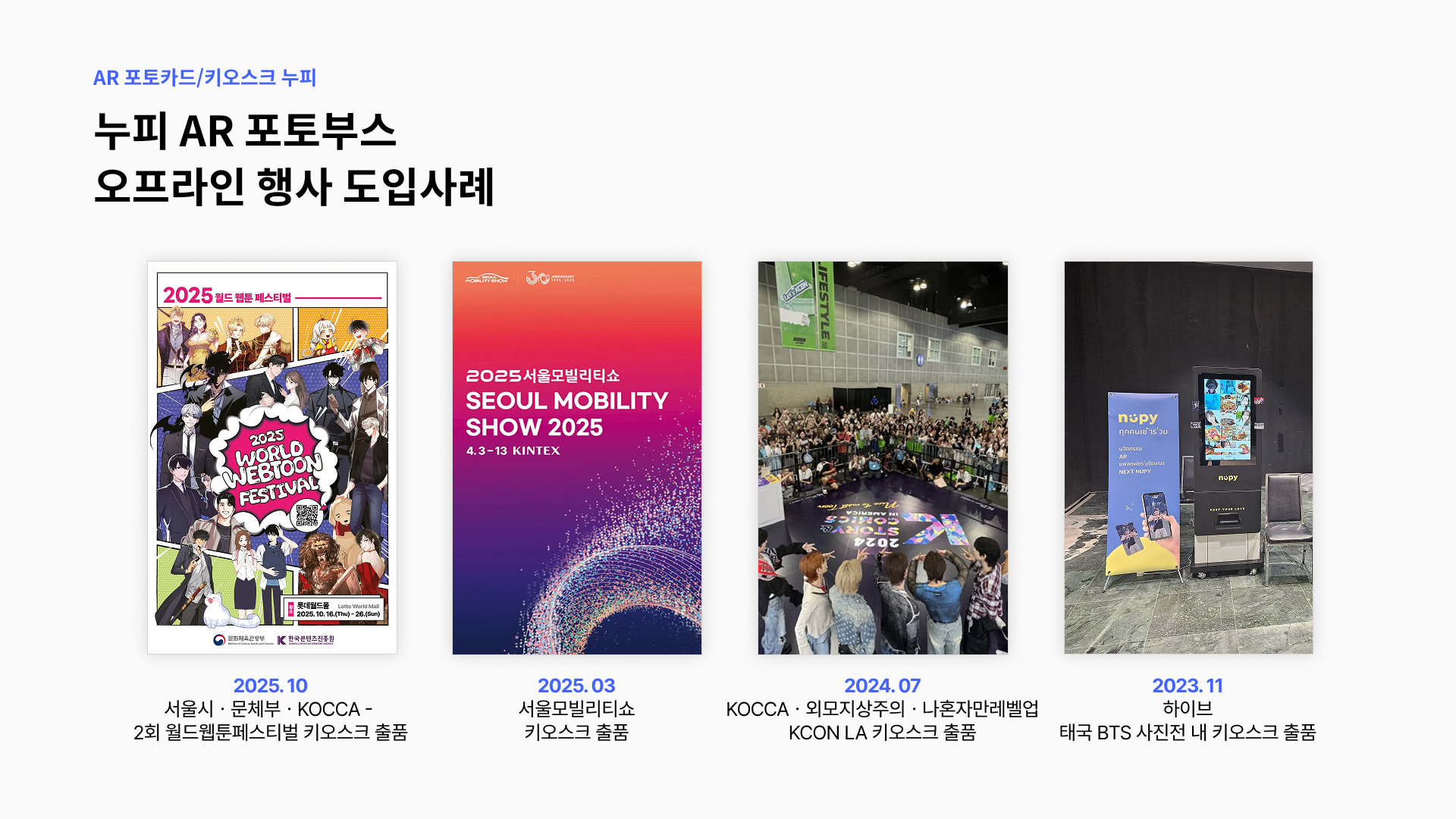 행사장 한 쪽에 AR 포토 키오스크가 놓이면, 행사장 분위기도, 행사가 끝난 후 참가자의 만족도도 확연히 달라집니다.