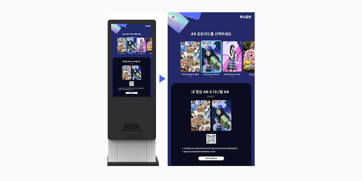 AR포토부스(AR포토존) 는 다릅니다. 실물 포토카드에 스마트폰을 갖다 대는 순간, 카드 속 이미지가 영상으로 살아 움직입니다. 증강현실(AR) 기술이 접목된 특별한 포토카드라고 할 수 있습니다.